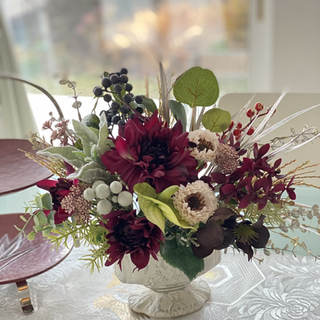 深いエンジ色のダリアとフィレノを使って素敵なアレンジメントを作ります。