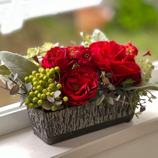 レッドのロゼット咲ローズとハーブで可愛らしいアレンジを作りますよ