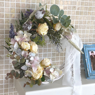 2021年 6月7月☆ 教室作品 ☆ クラシカルなアジサイとクリーム色のローズの色合いがとても素敵な作品です。ベルギーナッツやユーカリでアンニュイな雰囲気になりますね。大きさは小さめで手のひら位 20センチほど。 何処にでも気軽に飾れる大きさです。通年を通して飾れるタイプです。リボンがシフォンタイプでとてもすてきですよ。
